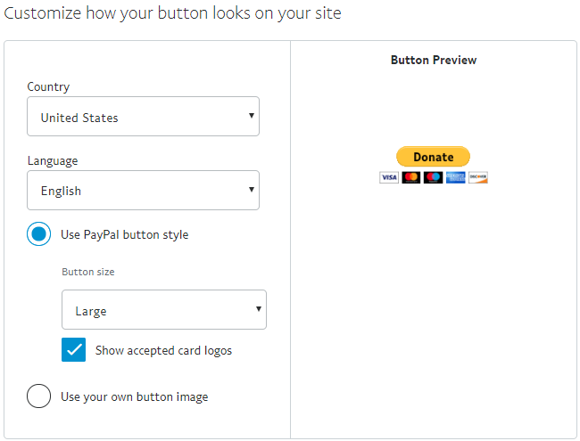 4. Customize your PayPal button how you like. You can choose a large button, which displays the yellow button and the accepted payment options below the button. Or, you can choose the small button, which only displays the yellow donate button. You may also customize the language of your button text.