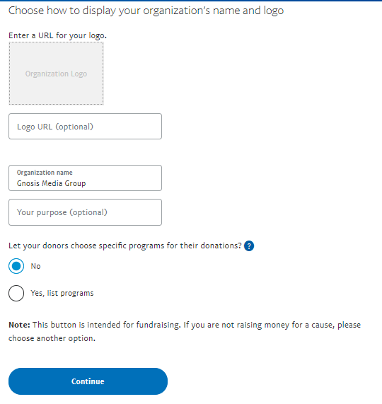 6. On the next screen, you have the option of including your logo on your checkout landing page. You can also include a purpose statement to tell your prospects what specific program they will be donating to. Finally, select whether you want this button to send donations to a specific program or not.