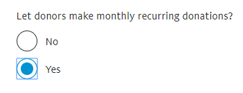 9. Choose whether you want donors to only give one-time or a recurring amount. If you select, “No”, then donors will only be able to make a one-time donation. If you select, “Yes”, donors will be able to choose either a one-time or a recurring monthly donation.