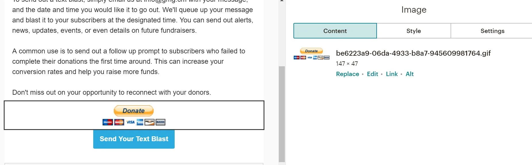 If you want to keep the same PayPal button image, then you would have to first upload the button image into Mailchimp. You drag the “Image” block into the email from the design view. Then place it in the email and link it to the donation link mentioned above (the “Shareable URL”). This will add the button icon to your email and when clicked it will take the user to your donation checkout page.